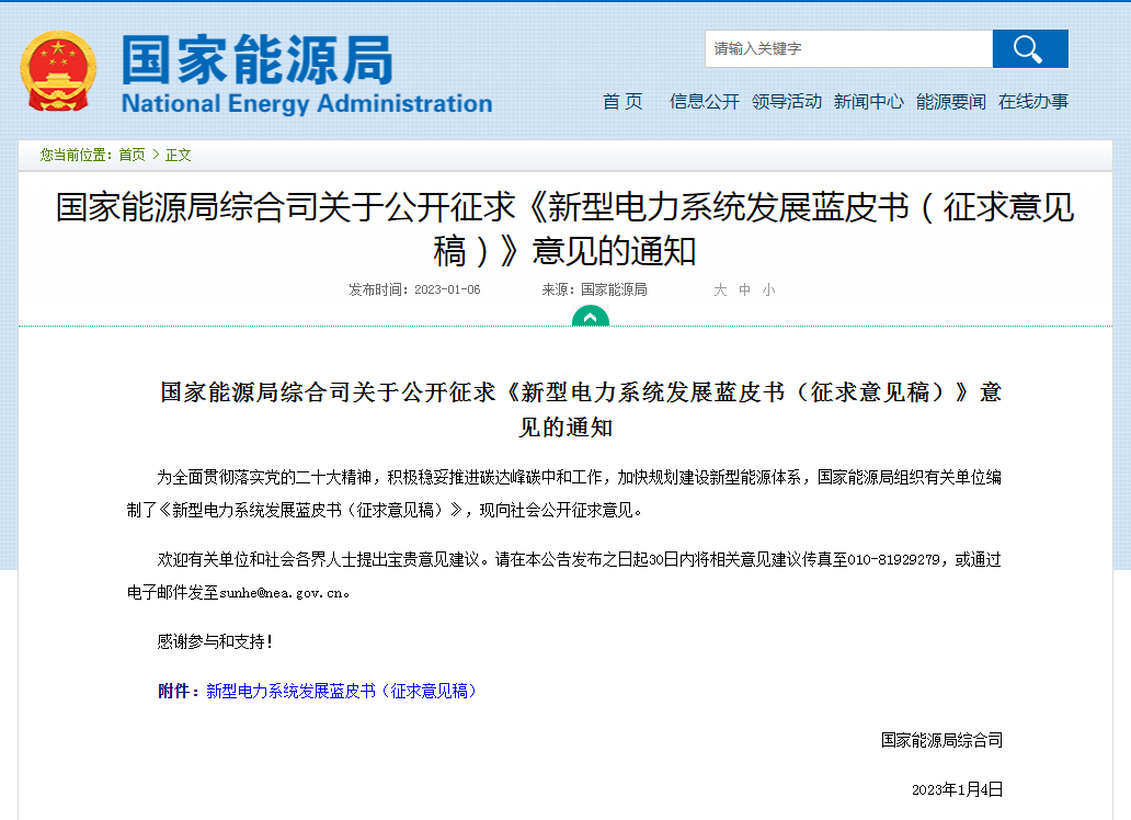 國家能源局綜合司關(guān)于公開征求《新型電力系統(tǒng)發(fā)展藍(lán)皮書(征求意見稿)》意見的通知