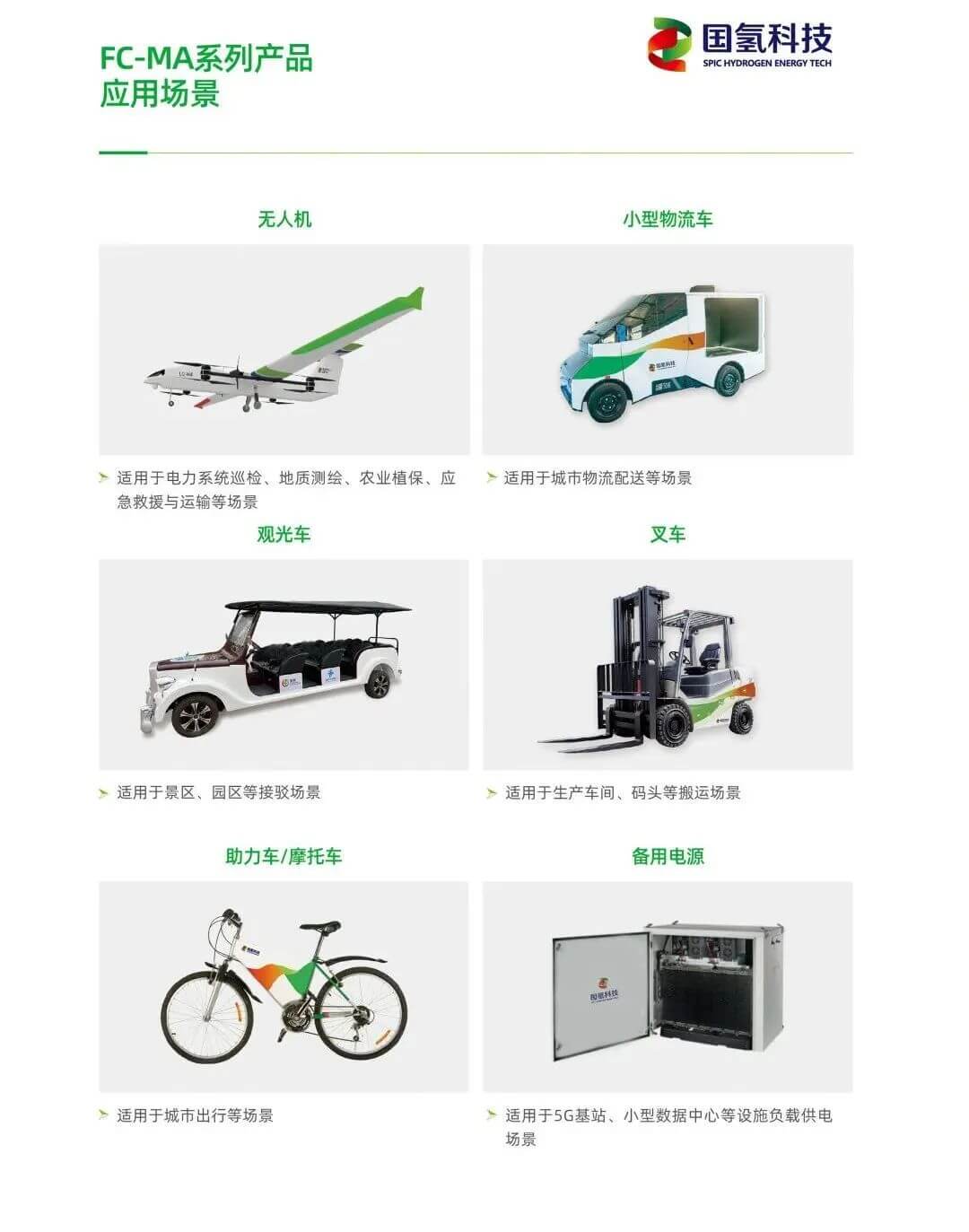 國氫科技自主研發的“氫騰”FC-MA空冷系列產品,核心部件全部自主化,具有輕量化、低成本、高可靠、長壽命等特點,適用于無人機、小型車輛、備用電源等場景。